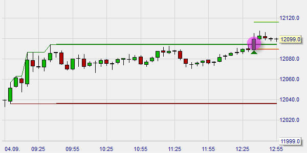 This example shows two thin lines (green and red) following the market price for the first 40 minutes. At 9h40 the highest and lowest prices become the entry level for a potential trade. They are represented by the thick red and green lines. In this example the market price breaks through the green line first (at about 12h40). This is a buy signal. A position is bought.