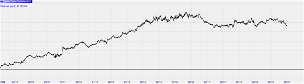 According to André Stagge the strategy works due to the fact that it rides the buying or selling waves created by big institutional investors after their morning meetings. The strategy’s results are positive and stable over time but sometimes the result goes sideways. This illustration shows a back-test of the Morning Break Out strategy applied on the DAX market index over a period of 10 years (2009-2019).