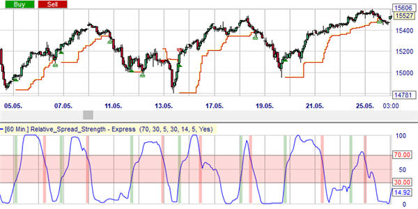 En principe, la stratégie RSS peut être appliquée à n'importe quel horizon temporel. Comme la courbe RSS est plus lisse et se concentre sur le cycle des prix, les résultats sont meilleurs dans les unités de temps plus élevées. Sur la plateforme NanoTrader, la stratégie est réglée sur 60 minutes.