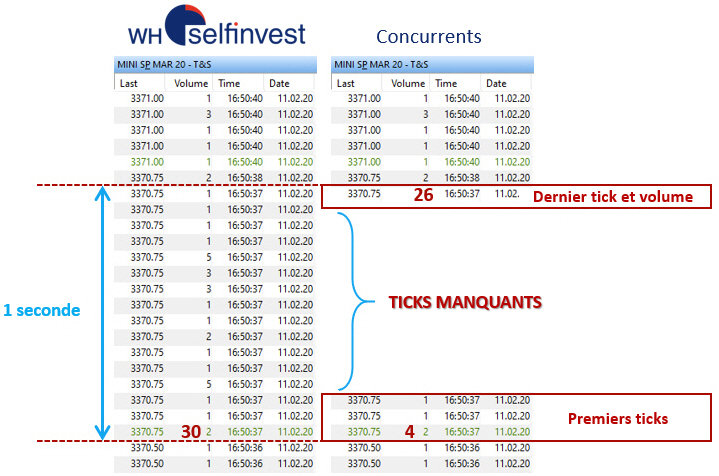Eurex, CME, Euronext et les autres marchés à terme distribuent des cotations tick-par-tick. WH SelfInvest affiche ces cotations tick-par-tick sur votre plateforme de trading. La plupart des autres courtiers, dont Interactive Brokers, collectent une grande quantité de données et ne distribuent que des cotations instantanées rafraîchies toutes les demi-secondes.