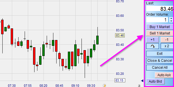 De unieke ChartTrader kan aan elke grafiek toegevoegd worden. Klik in de ChartTrader om markt-, limiet- en stoporders te plaatsen.