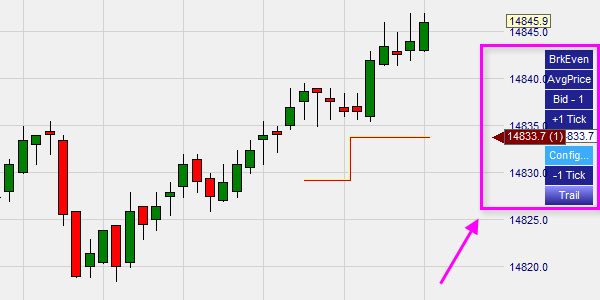 Met één klik kun je een stop loss order omzetten in een trailing stop of een break-even stop. Je kunt het orderniveau met 1 tick verhogen of verlagen, je op hetzelfde niveau als de bieders of de verkopers plaatsen of er net boven of onder. Deze toetsen zijn een must voor scalpers.